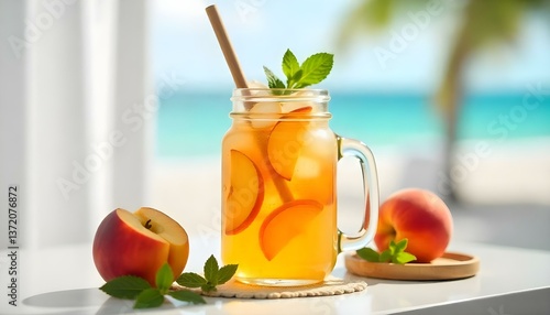 A refreshing peach iced tea in a mason jar, presented in a bright, summery setting