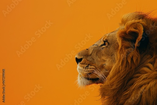 A regal lion faces sideways, its mane elegantly ruffled against a backdrop of vibrant orange, exuding strength and nobility.