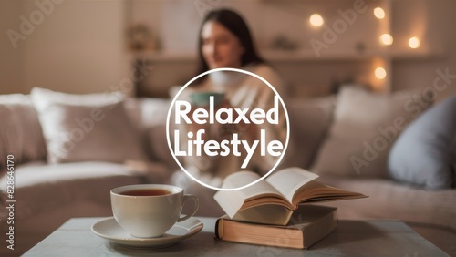 A 'relaxed lifestyle' text with defocused woman sitting on a couch with coffee and book, AI