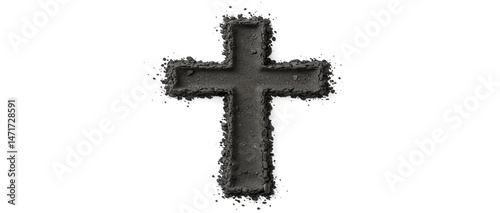 A religious symbol in the form of a cross created with ashes and isolated on white background