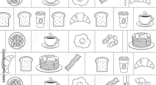 breakfast, food, drink, hot drink, tea, bread, toast, croissant, bacon, egg, sausage, fried, plate, cup, mug, pattern, design, graphic, illustration, line, art, black, white, simple, minimal, morning, meal, eat, cookery, delicious, tasty, bakery, eatery, cafes, menu, drawing, vignetting, outline, repeating, texture, background, tile, grid, vector, image, icon, symbol, kitchen