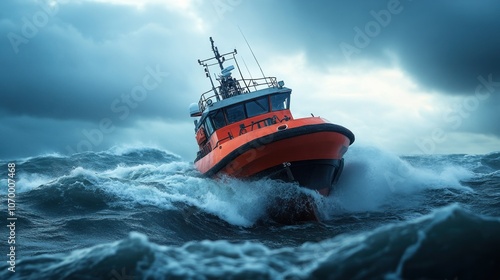 A rescue vessel battles massive waves in stormy weather, showcasing the crews determination as they navigate through treacherous seas under ominous skies