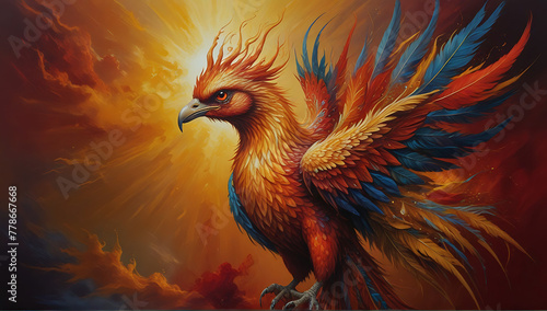 A resplendently ethereal phoenix of glistening gold and fiery reds, feathers shimmering like liquid sunlight, and eyes glowing with celestial wisdom. majestic