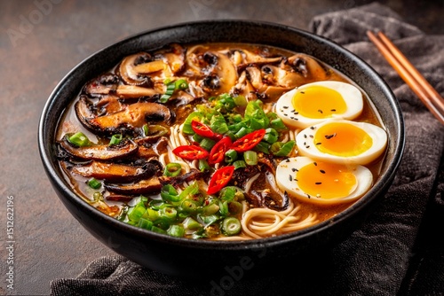 A rich bowl of ramen filled with noodles, soft-boiled eggs, mushrooms, and green onions, garnished with red chili, served on a textured surface in evening light