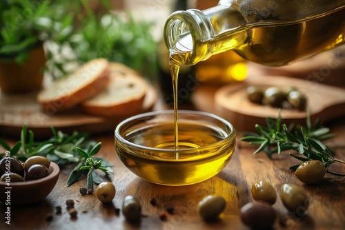 A rich, delicious extra virgin olive oil is poured into a bowl