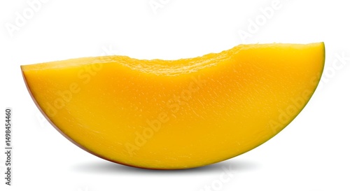 A ripe mango slice in close-up, showcasing its juicy texture and vibrant yellow color. It's a tempting and delicious fruit