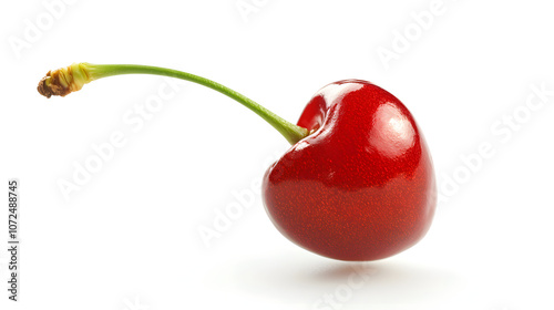 A ripe, shiny red cherry with a green stem isolated on a white background.