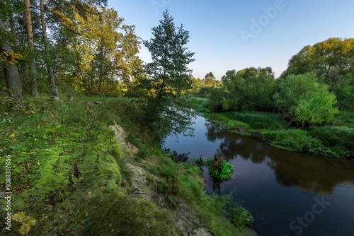river, tree, middle, water, calm, sky, blue, nature, green, landscape, forest, summer, lake, beauty, park, outdoors, grass, view, background, environment, scenic, season, travel, stream, day, autumn, duck pond, wood, sunrise