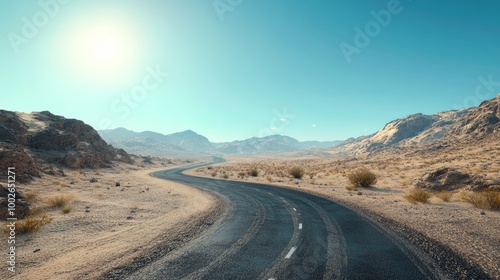road, winding, through, desert, vale, photorealistic, high, resolution, rugged, asphalt, rocky, terrain, sparse, vegetation, under, bright, clear, blue, sky, the, sun, overhead