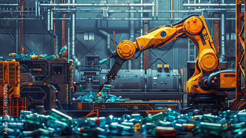 A robot arm is picking up plastic bottles in an industrial factory. with other machines and robots that work in different recycling stages