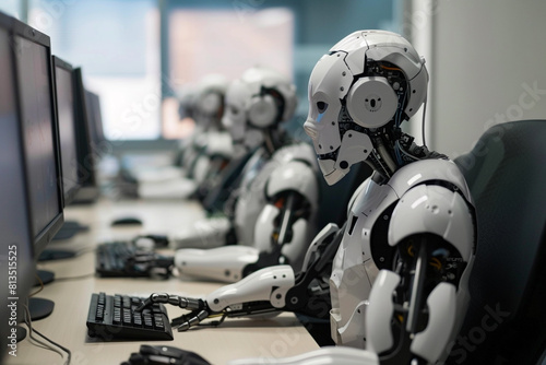 A robot with artificial intelligence works at a computer in the office IT Team, Help Center