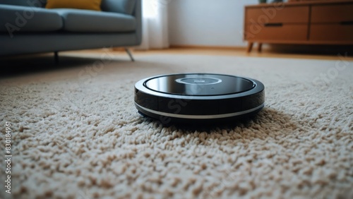 A robotic vacuum cleaner works on a beige carpet in a modern living room, enhancing home automation and cleanliness effortlessly.
