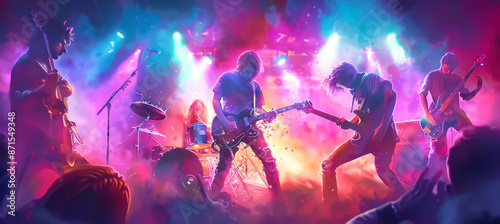 A rock band performs live on stage under brightly lit stage lights, with the lead guitarist playing a solo