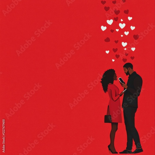 A romantic illustration of a couple exchanging affection amidst floating hearts on a vibrant red background.