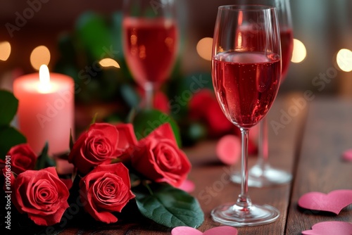 A romantic setup featuring red roses, flickering candles, and a glass of fine wine, perfect for a Valentine's Day celebration or intimate dinner setting.
