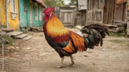 A rooster walking confidently along a dirt path, its iridescent feathers and striking red comb contrasting against the earthy tones of the farmyard