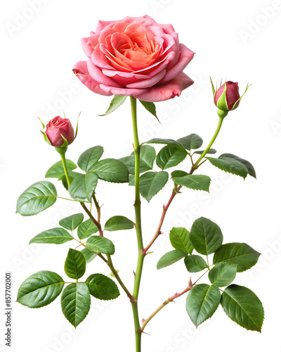 a rose bush with a long stem sticking out of the ground on a white background. AI GENERATED