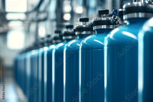 A Row of Blue Gas Cylinders Is Displayed in a Modern Industrial Setting
