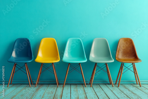 A row of five colorful modern chairs with wooden legs arranged on a rustic wooden floor against a bright turquoise wall in a minimalist interior setting