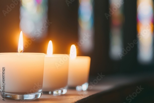 A row of glowing candles inside a dimly lit church with stained glass windows, evoking a sense of peace, faith, and spirituality