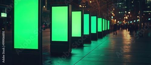 night, city, billboard, digital, screen, advertising, urban, street, signs, signage, glow, light, green, future, technology, wet, pavement, public, modern, illumination, display, downtown, landscape, city landscape, evening, dark, dusk, exterior, bright, design, abstract, pattern, row, line
