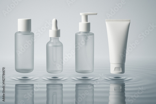 A row of minimalist skincare bottles floating above a mirror-like water surface, with soft ripples forming underneath each product - Generative AI