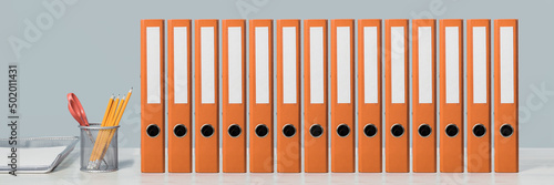 A row of mockup orange document binders or lever arch file with paperwork on an office shelf or desk. Paper tray and pencils. Business concept banner. Copy space