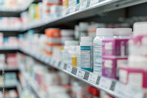 prescription, medication, pharmacy, bottle, label, health care, medicine, shelf, drug, display, pill, treatment, clinic, care, pharmaceutical, arranged, row, center, container, retail, professional, dosage, storage, safety, patient, order, blurred, background, organised, sharpened