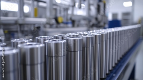 A row of shiny metallic cylinders on an industrial conveyor belt in a manufacturing facility, showcasing precision engineering and production.