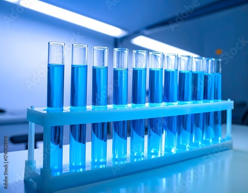 A row of test tubes, each containing a different liquid, giving off a soft, internal blue light, creating a bio-luminescent effect. They are set in a dimly lit, modern laboratory, with the blue glow.