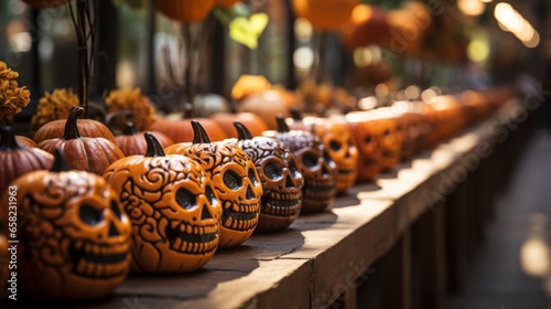 A row of vibrant orange pumpkins sits atop a wooden shelf, inviting customers to pick out the perfect seasonal snack to enjoy during halloween celebrations, both indoors and outdoors