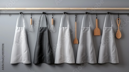 A row of white and black aprons hang on a rail alongside kitchen tools like whisks and spoons, symbolizing culinary readiness and organization in a modern kitchen.