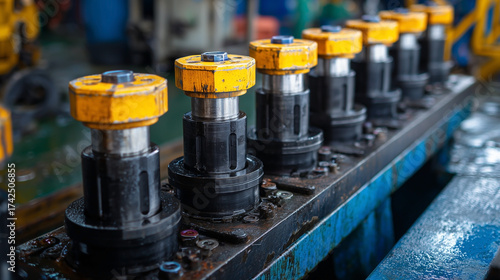 A row of yellow and black bolts are on a blue metal surface