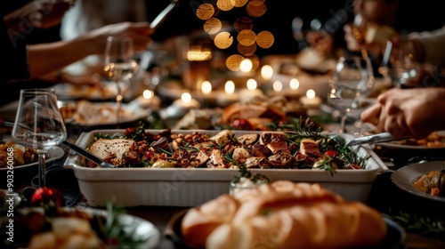 A rustic holiday table loaded with roasted food and festive decorations captures the joy and warmth of communal dining, with candles adding to the cozy atmosphere.