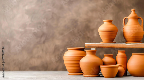 A rustic pottery workshop with shelves filled with hand-crafted clay pots, bowls, and vases, and a potter at wor