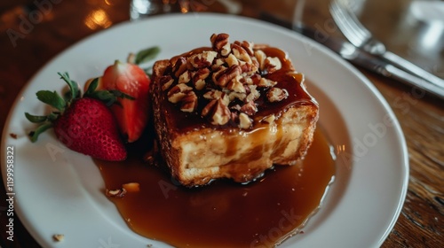 A rustic setting featuring a slice of honey toast topped with caramel sauce and chopped nuts, with a side of fresh fruit for a well-rounded dessert.