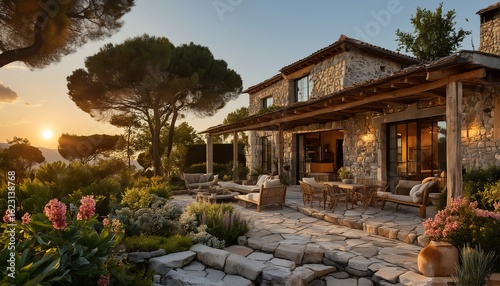 a rustic stone villa with a sprawling patio and lush gardens basks in the warm glow of a setting sun.