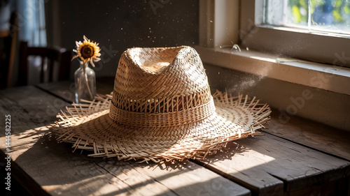 A rustic, weathered wicker hat captured in a photograph, showcasing its vintage charm and textured surface