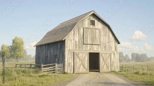 A rustic wooden barn stands peacefully in a green field under a clear blue sky.