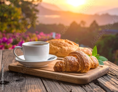 A rustic wooden serving board holds a cup of coffee with a croissant and bread against a scenic sunrise background