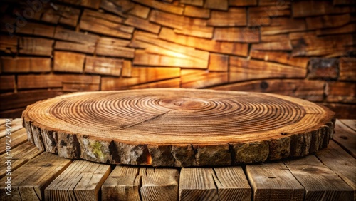 A rustic wooden table with a circular wood slice as a centerpiece, showcasing the natural beauty of wood grain and the warm glow of natural light