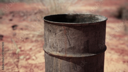 A rusty metal barrel sits upright in a dry, barren area with red earth and sparse vegetation. The sunlight casts shadows, highlighting the textures of the weathered surface.