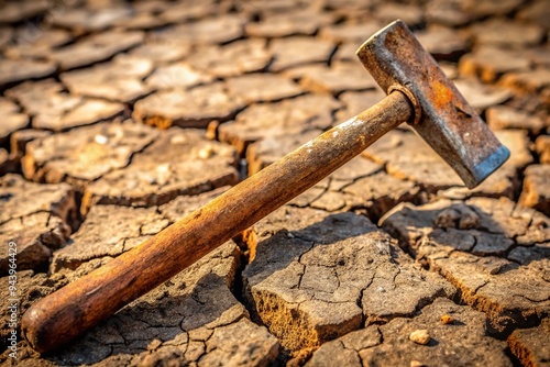 A rusty metal stake protrudes from the parched earth, its weathered surface and worn wooden handle telling a story of age and abandonment.