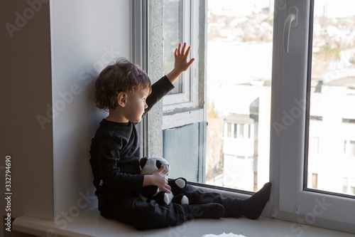 a sad boy sits by the window with a panda bear toy in his hands during quarantine over the rapid spread of the coronavirus pandemic around the world. To stay home. preventive measures.