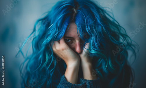 A sad expression of a white woman with blue hair, symbolizing depression and helplessness