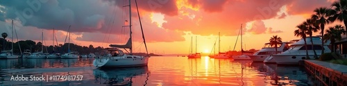 A sailboat is anchored in the marina as sunset approaches in Puerto Madero harbor, peaceful atmosphere, serenity