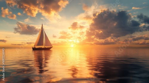 sky, ocean, sunset, cloud, boat, sail, sailboat, water, horizon, evening, gold, sun, dramatic, peaceful, calm, serene, nature, landscape, seascape, travel, adventure, nautical, voyage, journey, freedom, calmness, relaxation, summer, bright, warm, beautiful, scenic, picturesque, silhouette, colours, light, vibrant, abstract, background, design, art, photo, image, illustration, graphic, vector, stock, photo