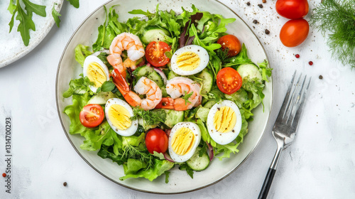 a salad with lettuce, cauliflower, shrimp, tomatoes and hard-boiled eggs presented on a pretty dish on a modern table