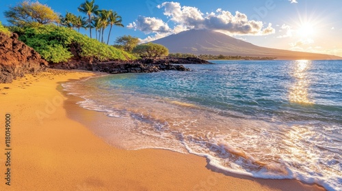 A sandy beach with palm trees and a mountain in the background