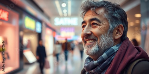 A satisfied man walks through a bustling mall, wearing a warm scarf and a smile. He radiates happiness, embracing the thrill of shopping and leisurely exploration